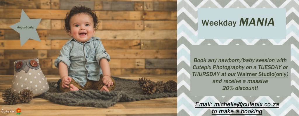Latest CutePix News Toddlers news August Studio Promotion! Michelle August 1, 2016 To celebrate the opening of my studio, my birthday and woman’s month, I am running the following promotion on all baby/newborn sessions booked at my studio on a Tuesday and a Thursday. Post navigation The most beautiful little foxManilal | Lifestyle Leave a Reply Cancel replyYour email address will not be published. Required fields are marked *Comment * Name * Email * Website Save my name, email, and website in this browser for the next time I comment. Δ